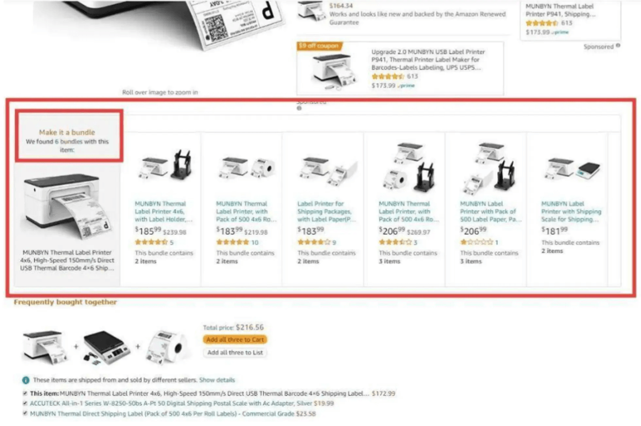 图中 make it a bundle 是商家设置的虚拟捆绑商品,展示区域在 frequently bought together 上方。