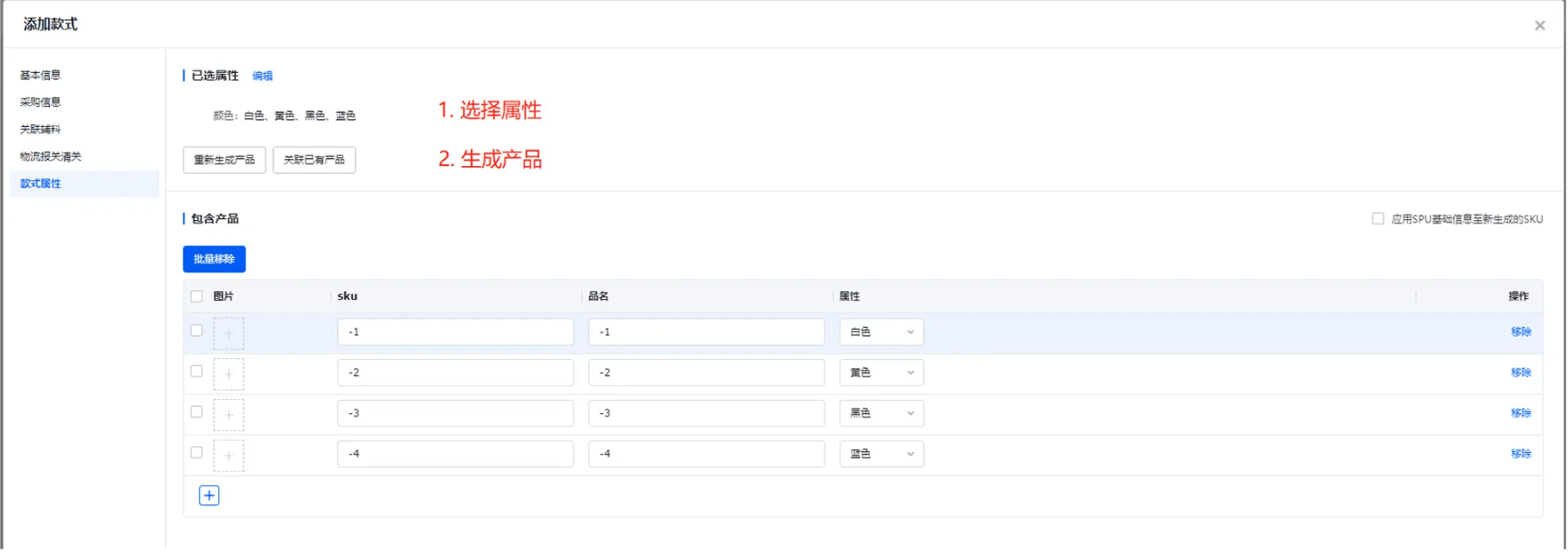 和单品的差异在于新增“属性”模块,商家在编辑完基本、采购、报关等共同信息后,可通过选择属性,一次创建生成多个单品,单品间由 SPU 码相互关联。