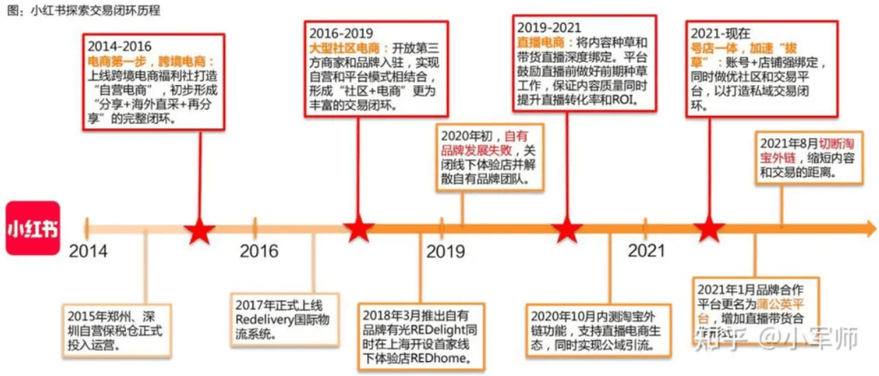 复盘来看,小红书自 2015 年试水电商,第一阶段是国内保税仓模式,但 GMV 规模有限;2016 年联手搭建第三方生态,陆续邀请淘宝商家入驻、削弱自营电商投入;2021 年 7 月推动直播带货,并于一个月后提出“号店一体”运营模式(包括品牌商家号、个人品牌商家号、个人号);2021 年 8 月切淘宝外链,缩短内容和交易的距离。
