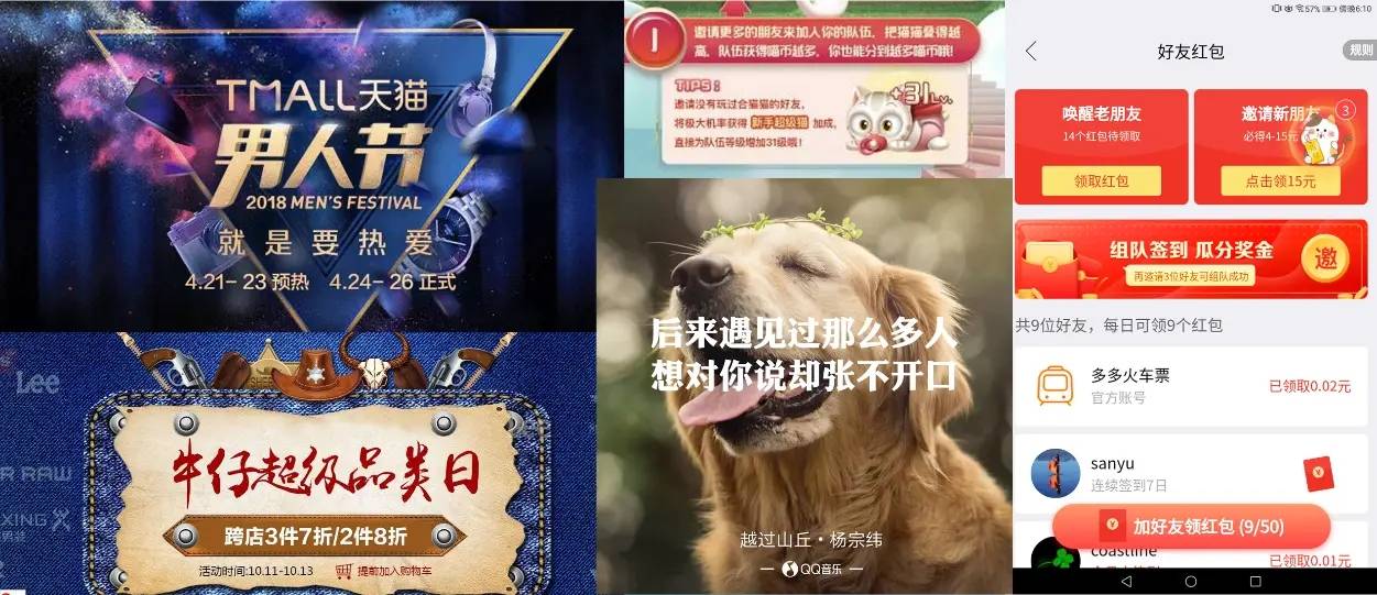 常见的场景有时间节点类:比如女神节、男神节、暖春节等等;品牌、品类、商品本身的策划活动:比如超级品类日,超级品牌日,新品上市日等;时事热点类:比如新冠病毒期间消毒用品的活动,世界杯期间啤酒节、烧烤节活动;还有一种内嵌产品之中的自传播设计,如拼多多抢好友红包页越多好友参与则可抢红包越多,各大音乐app的自制歌词海报功能等。