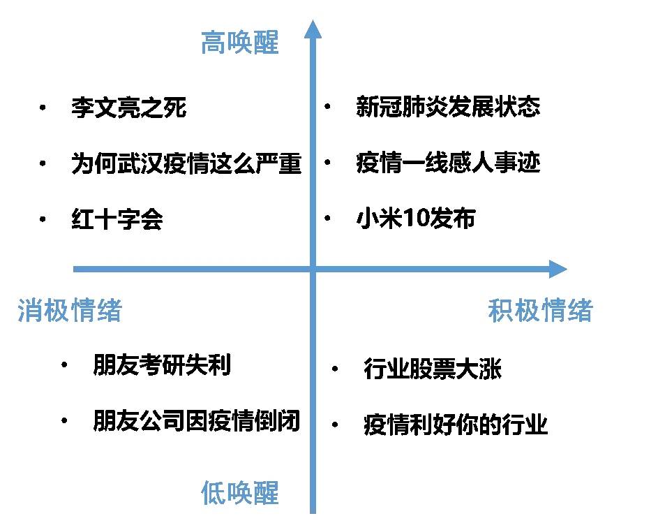 我们可以利用情绪四象限将自传播活动的情绪分为高唤醒的积极情绪、高唤醒的消极情绪、低唤醒的积极情绪以及低唤醒的消极情绪。