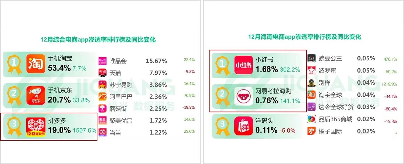 以电商平台为例,据极光大数据2017年12月份移动互联网电商app渗透率排行榜及同比变化显示:自2017年各大电商平台纷纷引入社交因素后,那些在产品的核心、主线功能融入社交基因的产品实现了快速的增长。