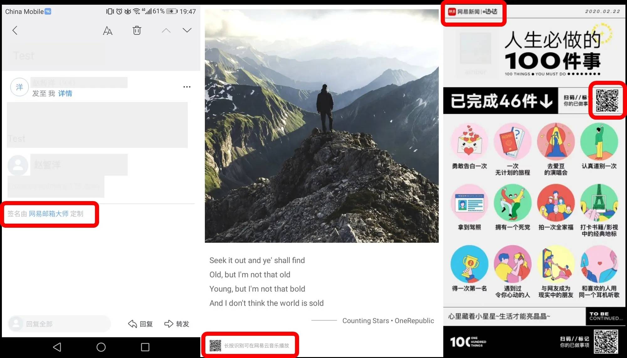 比如使用网易邮箱大师发送邮件时都会自动在邮件末尾加上:签名由网易邮箱大师定制;网易云音乐制作歌词海报时也会在海报上加上网易云音乐的logo和二维码;前段时间朋友圈疯传的网易哒哒做的“人生必做的100件事”H5页面中自带的二维码一扫即可参加……对于海报型自传播活动,要注意提示语不能太强势也不能低调到用户难以发现,如果用户对活动感兴趣,他们自然会愿意参与进来,过度宣传不仅影响美观,甚至会让用户反感,不愿分享。