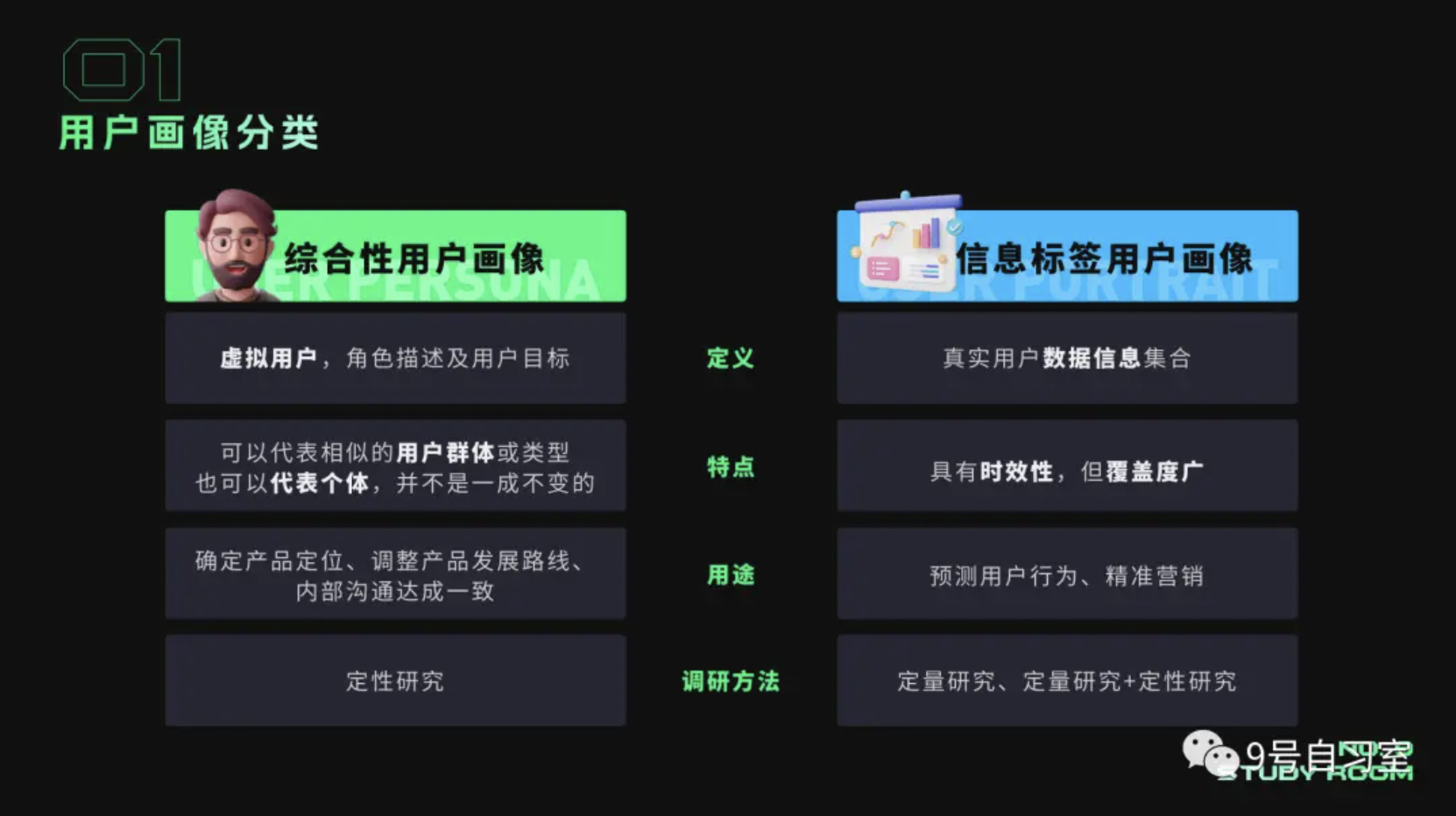 用户画像在「宏观」上来说就是“具像化对于用户的认知”,在探索用户足迹的过程中,建立【市场细分和用户分群】,帮助产品定位、调整发展路线;在「微观」上主要是“精细化”,比如【推荐、搜索、精准营销、定向投放、风控、定量和定性分析,数据化的运营用户分析】,协助精准营销。