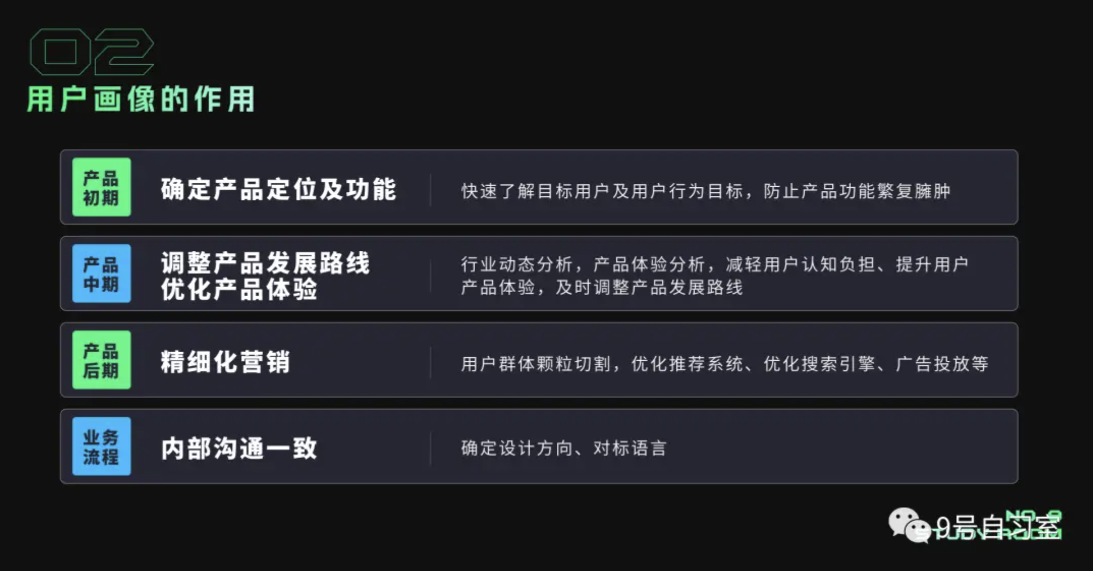 针对不同的业务发展及不同阶段的产品进程,用户画像对应的作用也是不一样的: