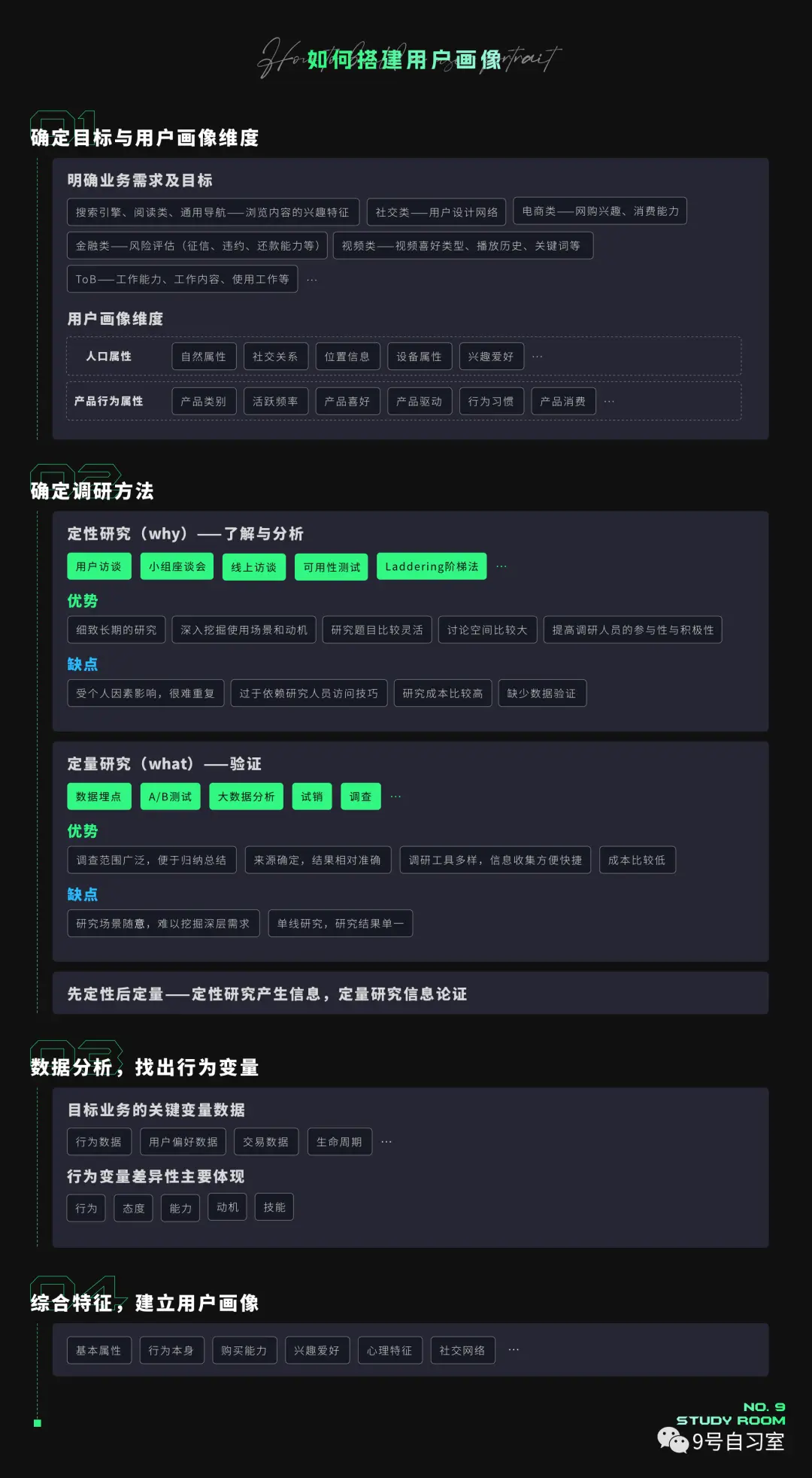 一般情况下建议以“定性研究作为信息产生,定量研究作为信息论证”方式进行调研,先通过用户访谈的形式,发现用户群体之间差异性较大的维度,分析用户差异的关键点,再进行定量研究论证真正的差异关键点。