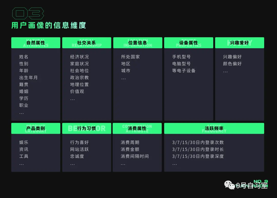 用户画像可以按照人口属性和产品行为属性进行综合分析。人口属性一般有自然属性、社交关系、位置信息、设备属性、兴趣爱好等等;产品行为属性则有产品类别、活跃频率、产品喜好、产品驱动、行为习惯、产品消费等。