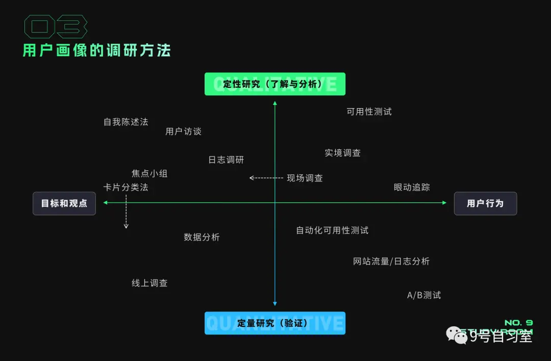 确定调研的画像维度后,需要选择合适的调研方法进行用户画像信息的收集,一般的调研方法有3种:定性研究、定量研究、定性+定量研究。