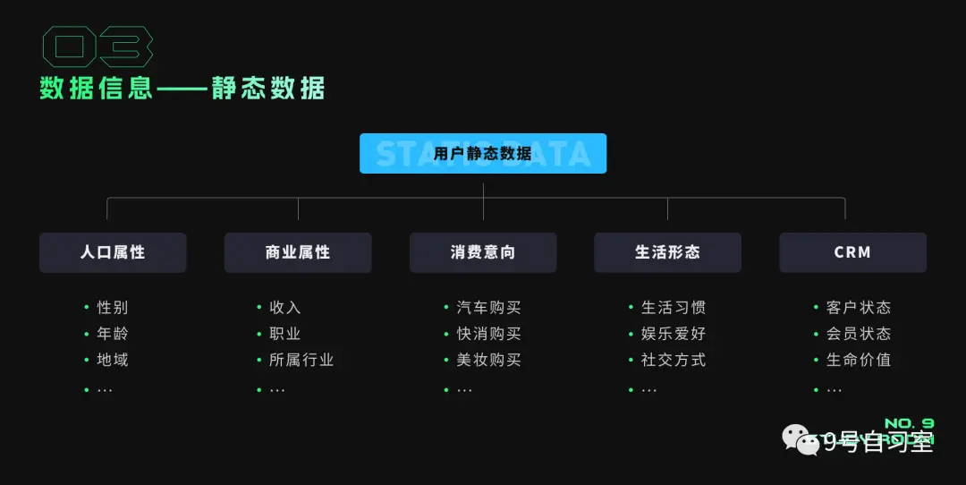 确定研究人群后,通过递减维度、变换视角得到当前人群的状态、特征等信息,比如用户的人口属性、商业属性、消费特征、生活形态、CRM等相对稳定的信息,可以通过最为精准的数据挖掘进行获取,但如果遇到数据有限的情况可以通过定性与定量结合补充的方式进行获取。