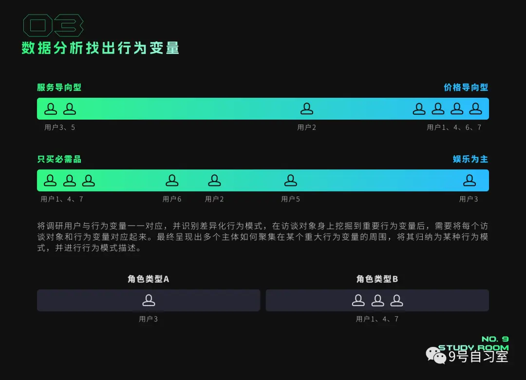 在明确目标与调研方法后,需要对所有采集到的信息数据进行分析,找到目标业务的关键变量数据比如用户网络行为数据、用户偏好数据、交易数据、生命周期等,将调研到的用户与行为变量一一对应,并识别差异化行为模式,需要注意的是不要将重点放在人口统计方面,行为变量更重要。