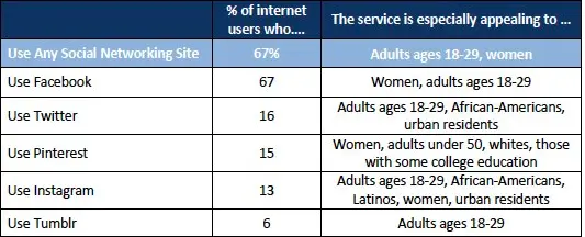 据皮尤研究中心发布的一份调查数据显示,接受调查的美国互联网用户中,有 67% 的会使用 Facebook,使用 Twitter 的为 16%,而使用 Pinterest 的则为 15%,仅比 Twitter 少了 1 个百分点。