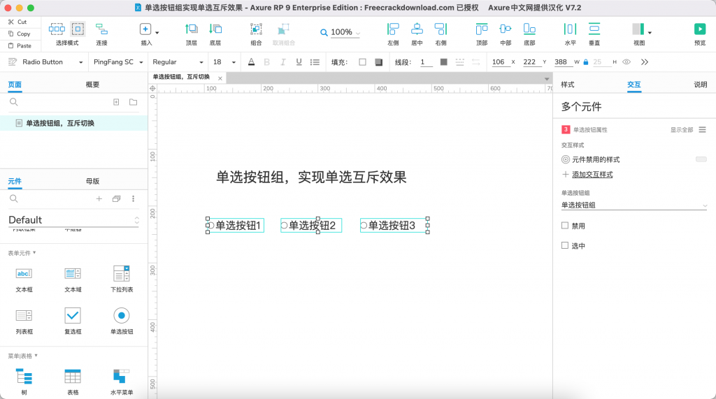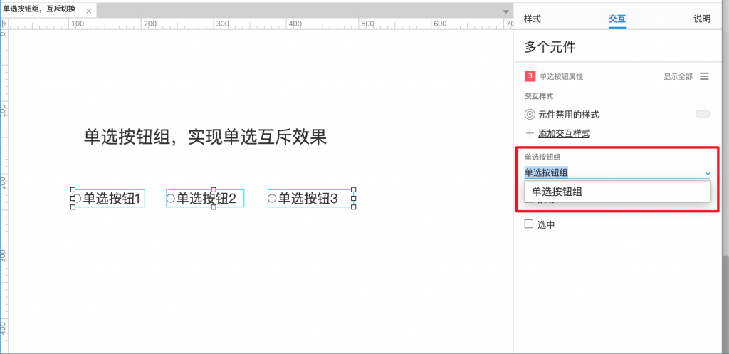 2、选中所有需要互斥效果的单选按钮,在右侧交互面板中,填入单选按钮组名称,这样就实现了互斥的效果了