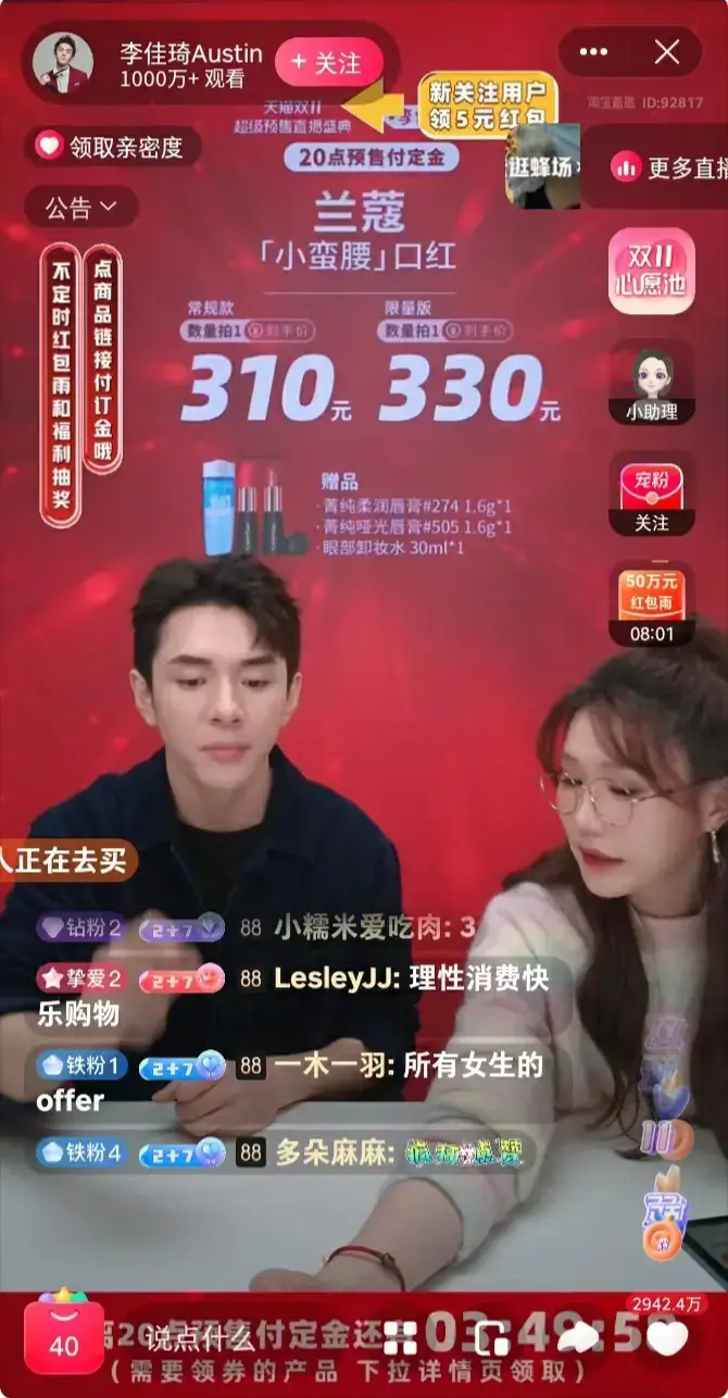 然而,就在9月20日,“消失”了109天的李佳琦闪现淘宝直播间宣布“所有女生们,我回来咯”、“现在不需要的东西可以不用买,双11有更优惠的价格让大家囤货”。刚回归的李佳琦一边向粉丝强调理性购物,一边向品牌喂下“定心丸”——今年双11至少还有李佳琦。