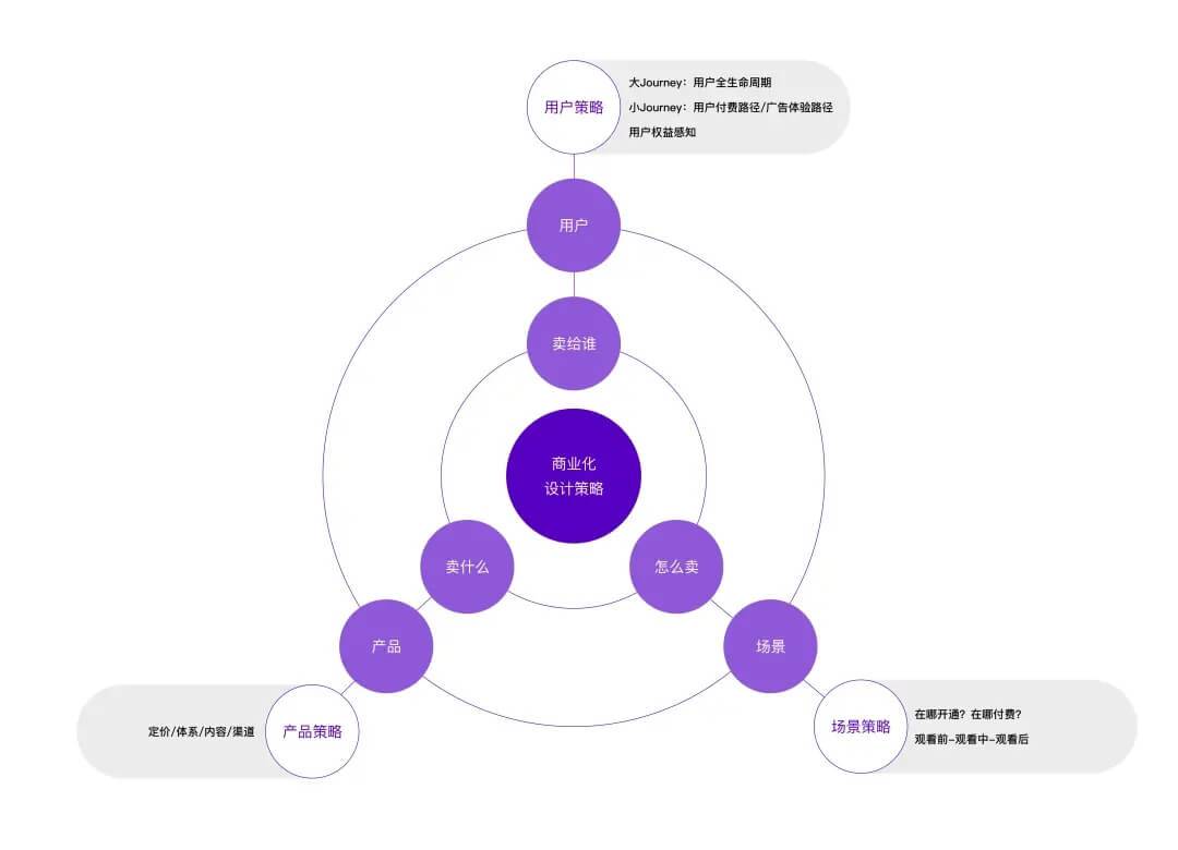 在是互联网背景下,不管是广告、会员、电商、游戏在内的哪种变现方式,都满足这三者的关系:用户(卖给谁),产品(卖什么),场景(怎么卖)。在这思路下去思考和列举这里面的相关因素,构建其相关的内容,便得到以下模型,暂且称之为:商业化设计策略三环模型,接下来便一步步讲述这个模型的拆解和使用。