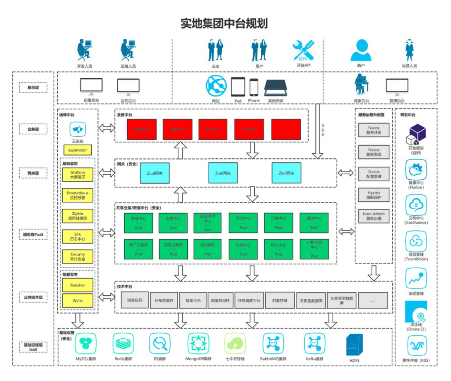 某房地产集团中台产品规划全景图,包括数据中台,营销中台,物业中台,会员中台,金融中台,技术中台等技术中台包括消息列队、分布式缓存、搜索平台、微服务组件、任务调度平台、对象存储、关系型数据库、非关系型数据库等数据中台共享业务包括账号中心、会员中心、商家中心、商品中心、支付中心、订单中心、通信中心、客户主数据、项目主数据、组织架构、礼券中心、积分中心、工单中心、评价中心等