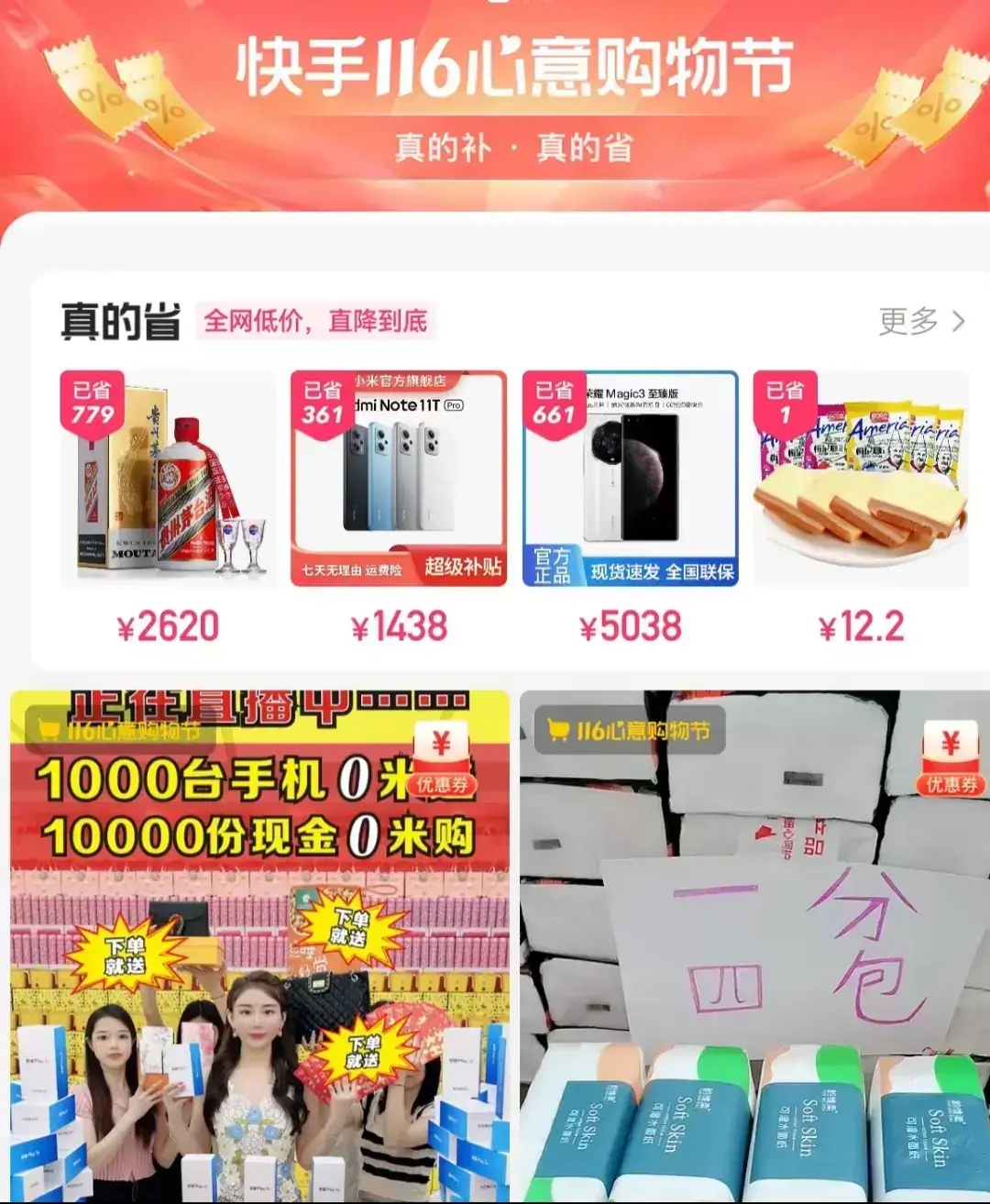 从优惠力度看,快手“每60减6”的优惠力度明显不及京东的双档位促销,也赶不上天猫的“每300减50”。这可能和快手平台的电商商品单价普遍偏低有关。