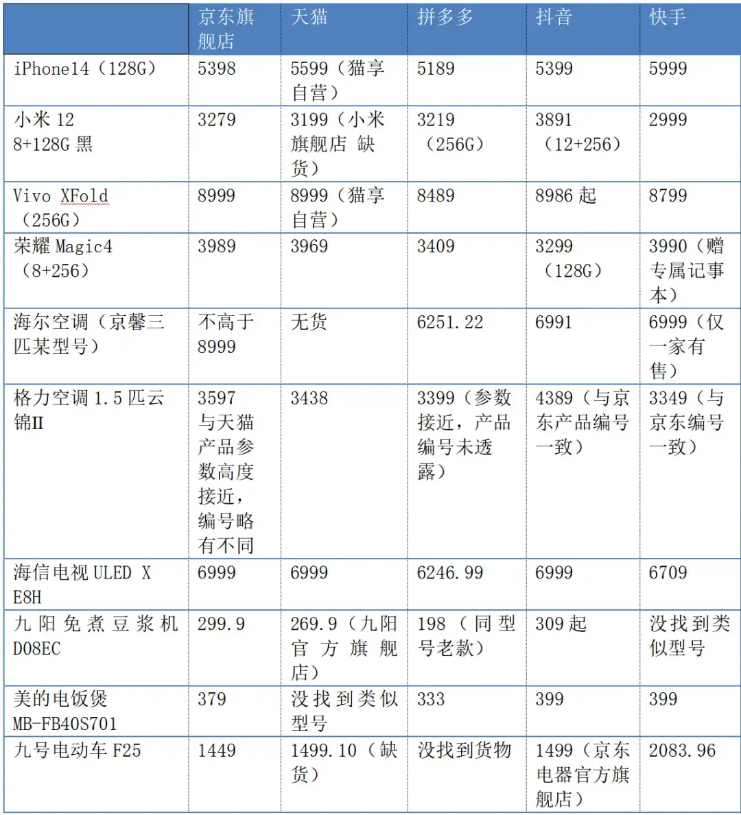 陆玖商业评论选取了有安装服务需求的大家电,和无安装服务需求的小家电,以及手机、电动车等产品,在京东、天猫、拼多多和抖音、快手5个平台做了对比。