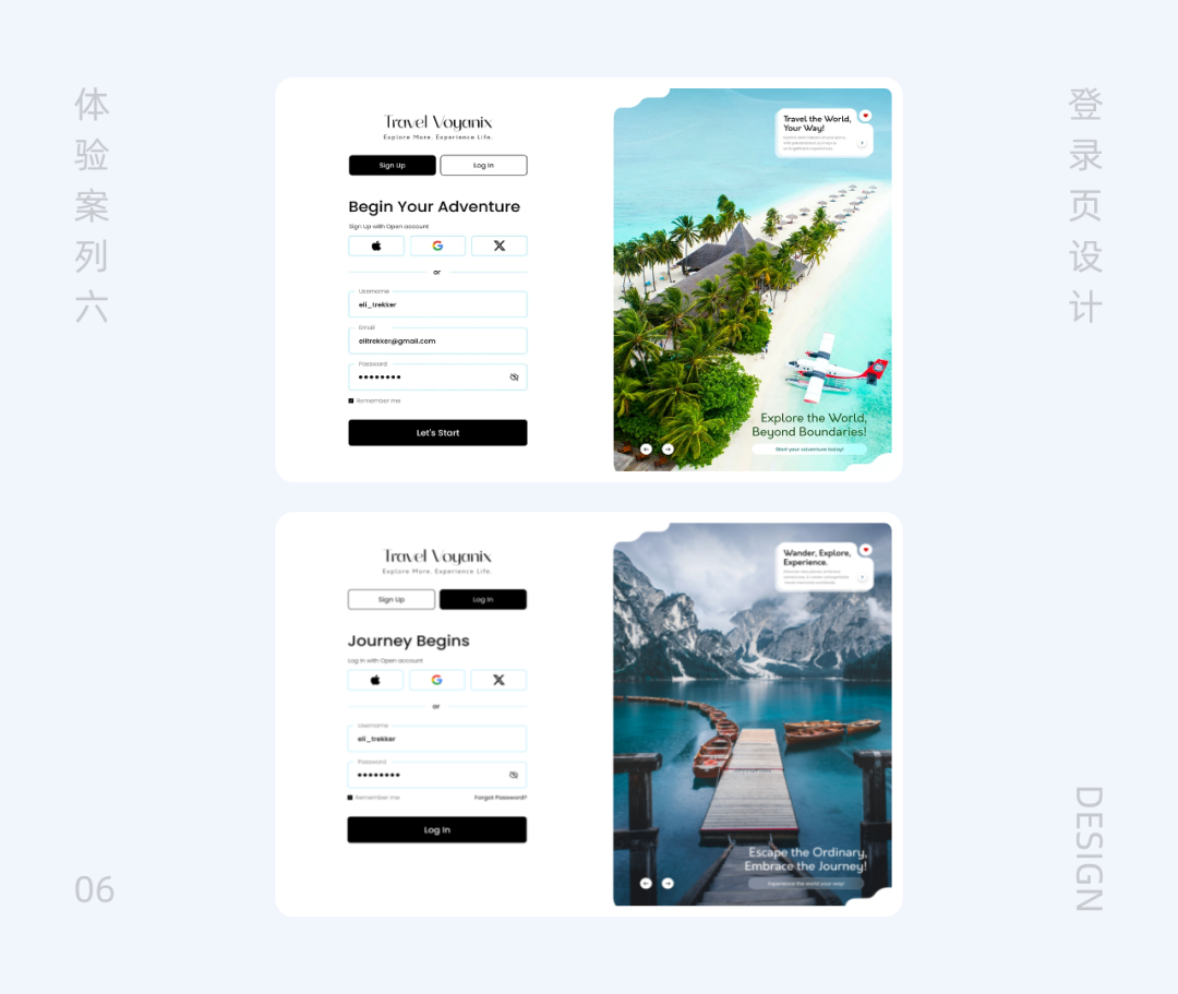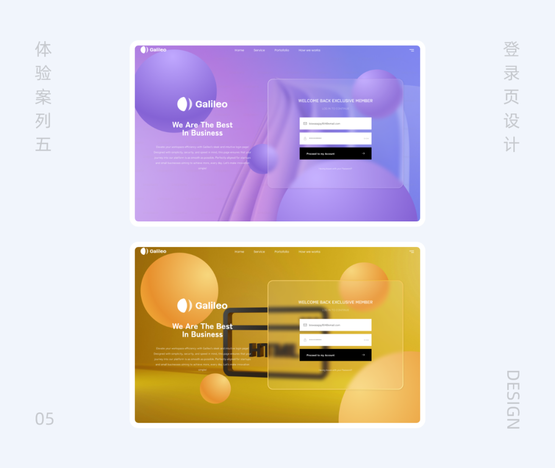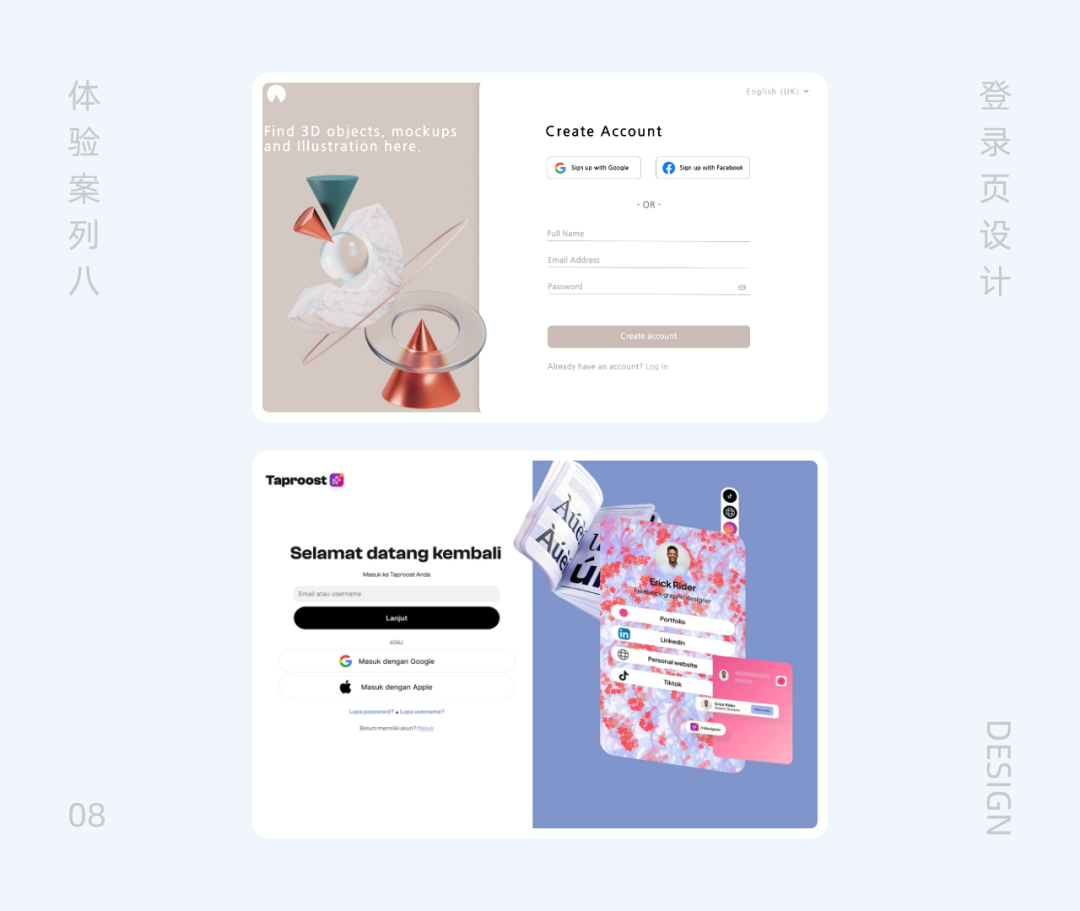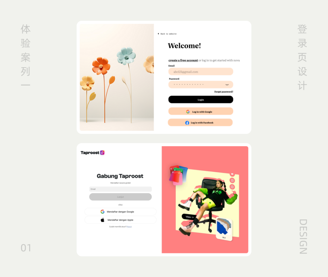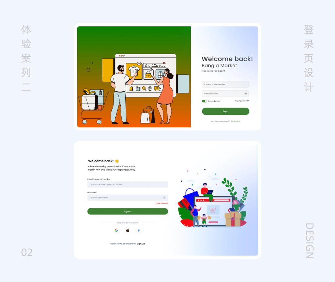 - 构图:两者均采用经典的左右分割构图,这是登录页最稳健高效的布局之一。