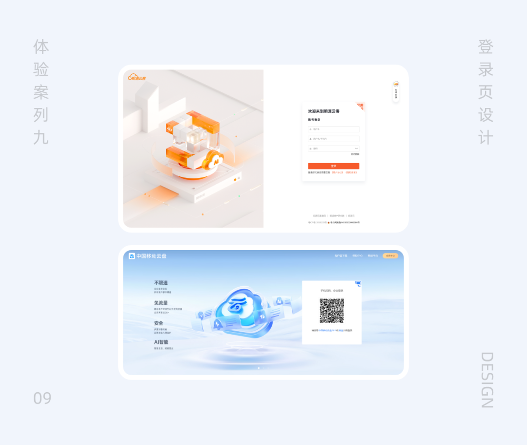 - 构图:两者都采用了清晰有力的左右分割构图,左侧是强有力的品牌口号,右侧是功能清晰的白底登录框。
