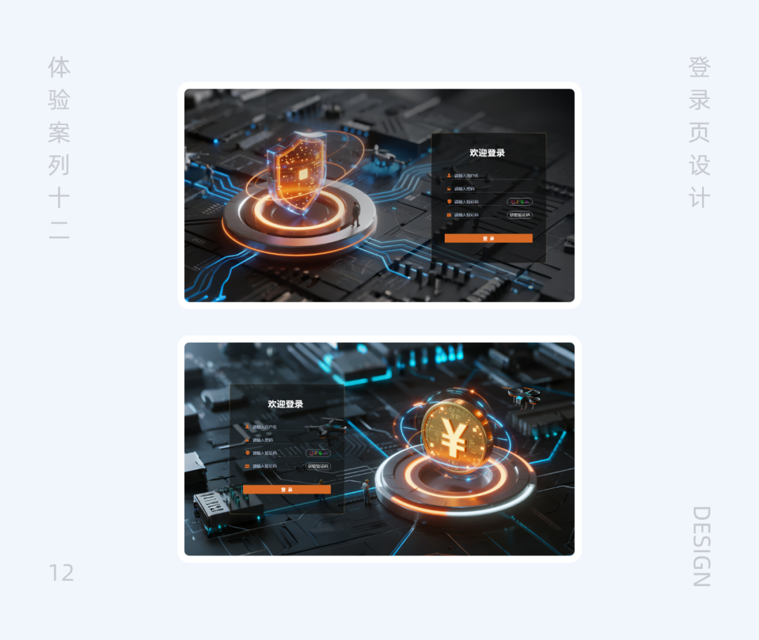 - 构图:两者都采用中心聚焦式构图,将最具科技感的可视化元素置于画面中央,登录框作为功能面板悬浮其上。