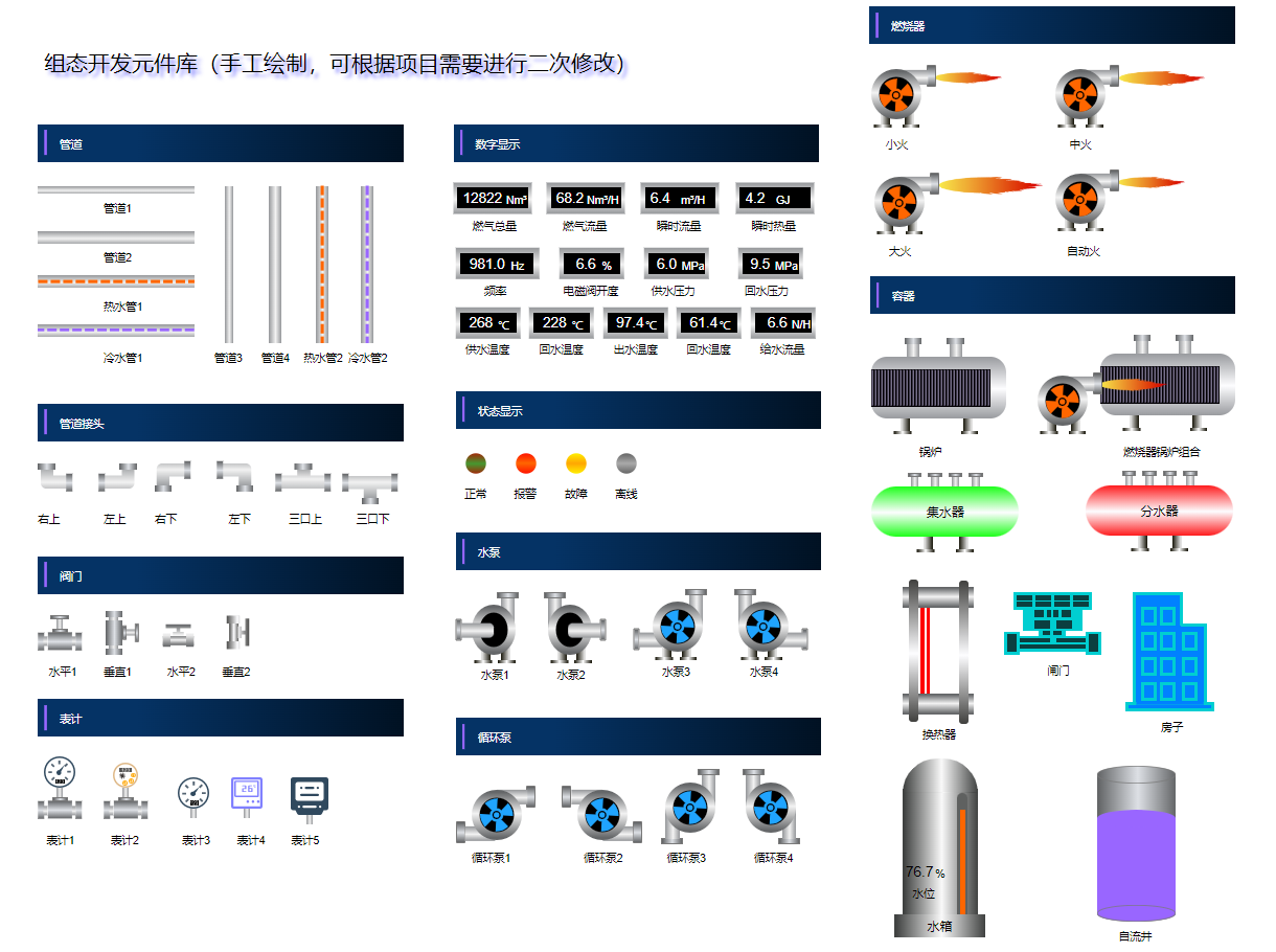 本作品是一款强大的组态模开发元件库,通过简单的拖拉拽操作,即可设计出满足企业各类数据管理场景,提供的动画设计功能还原企业的真实业务场景,全方位提升企业的数据价值。可广泛应用于能源管理,智慧供暖,锅炉房监控,换热站监控,工业物联等项目中。