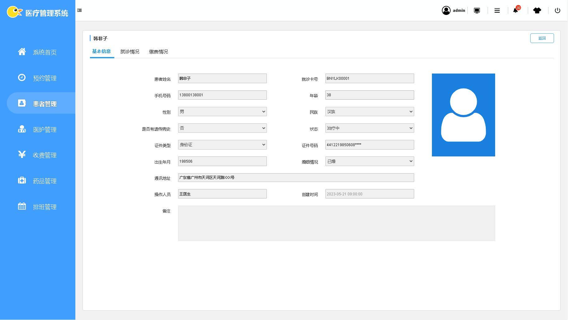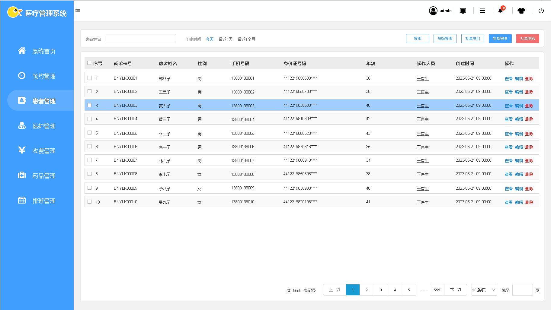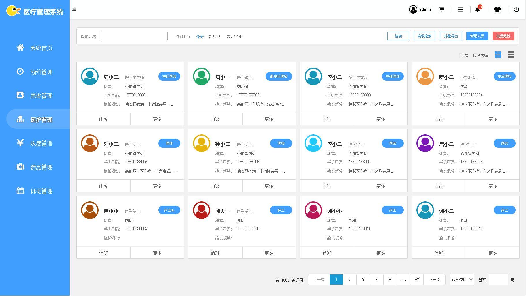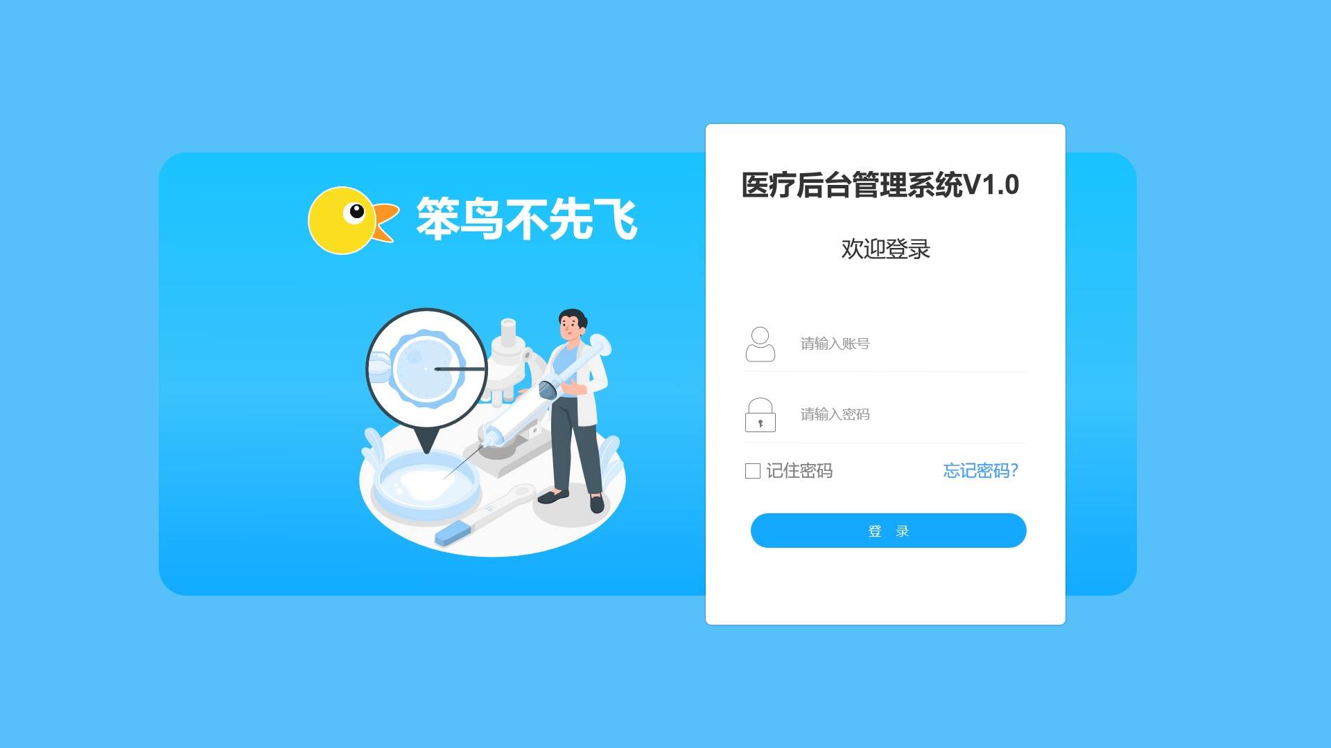笨鸟医疗后台管理系统的设计理念是设计一款方便医疗行业管理人员使用以及能给决策者提供决策帮助的管理系统,主要用于管理、分析、统计、维护医疗后台数据。主要功能包括:系统管理(部门管理、登录账号用户管理、角色管理、权限管理、流程管理以及系统日志),大屏展示,系统首页,预约管理,患者管理,医护人员管理,药品管理、收费管理以及医护人员排班管理等功能模块,结合大数据分析,帮助医护行业提高管理效能以及提供决策数据帮助。