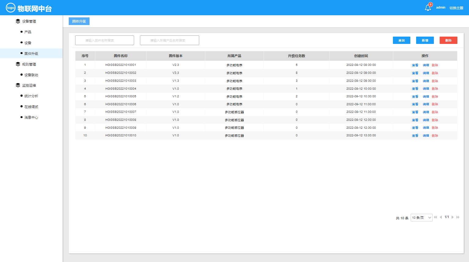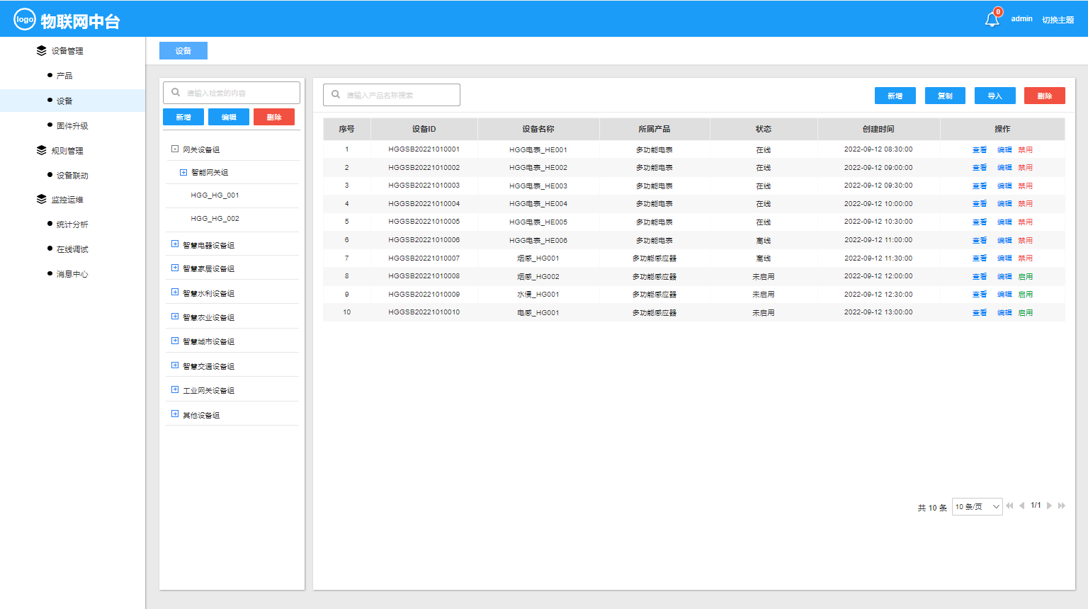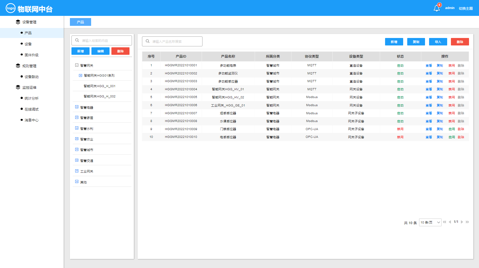 物联网中台作为连接业务应用和产品设备的中间层,减少各种复杂的设备接口的另行开发,实现设备的快速接入并提供海量设备的接入和管理,支持用户快速构建各种物联网的业务应用。本中台主要包括:产品、设备、固件升级、设备联动、统计分析、在线调试以及消息中心的功能模块。