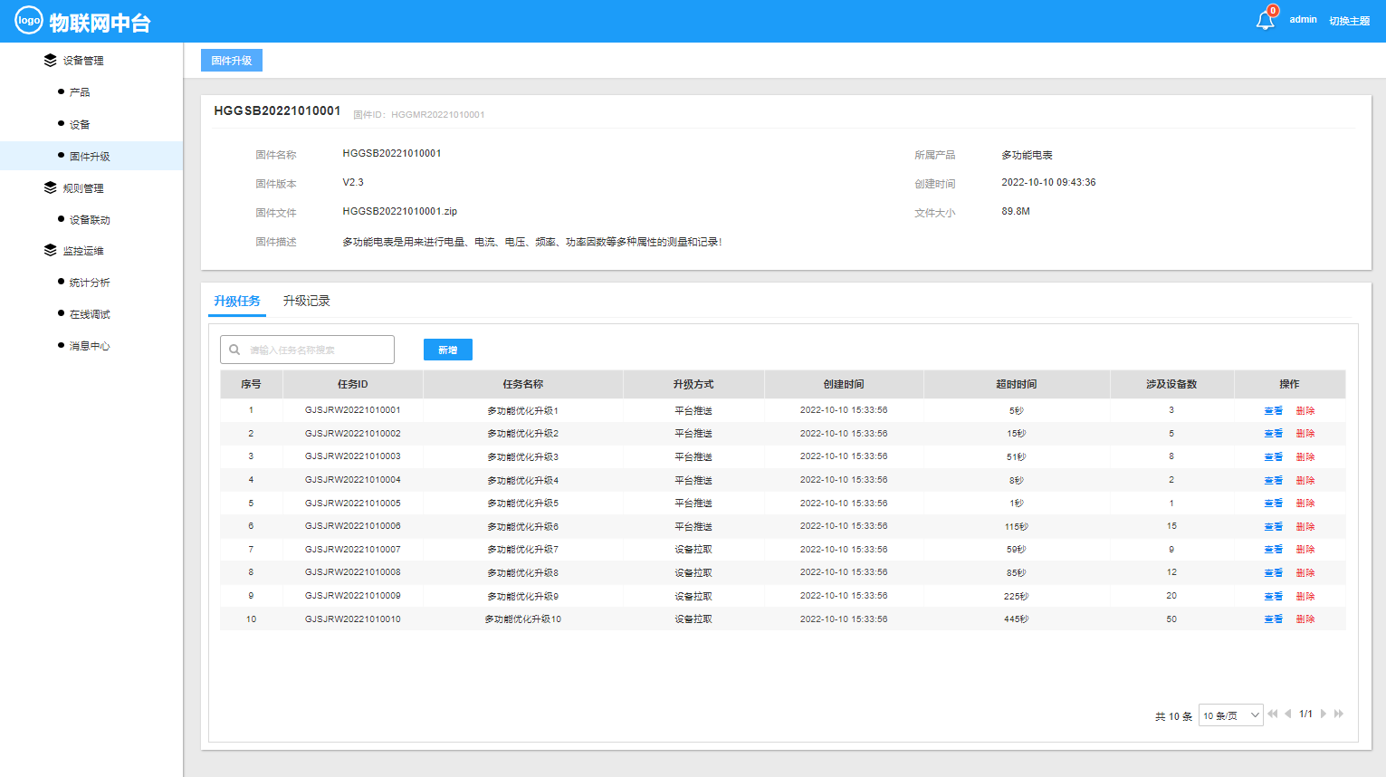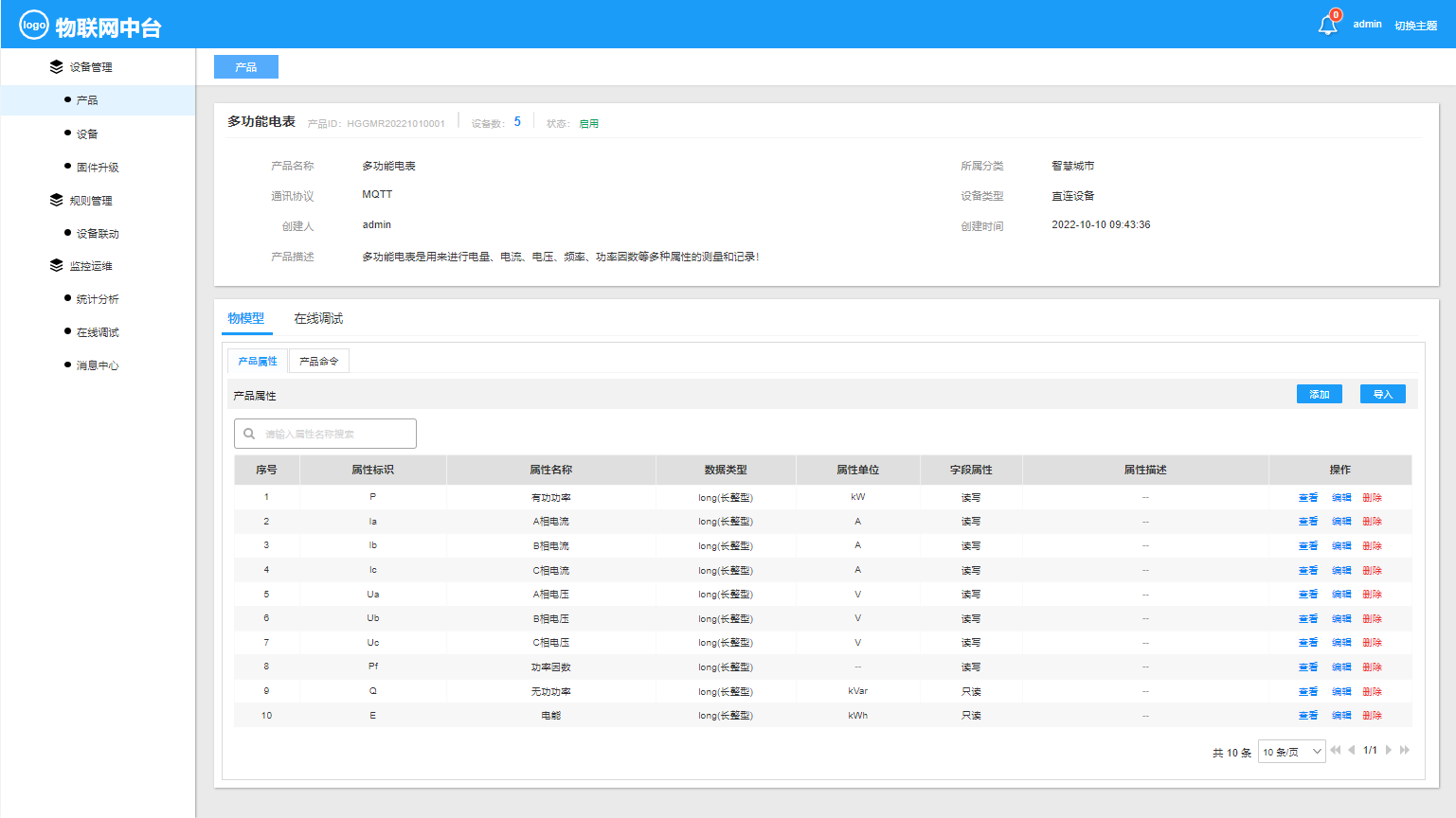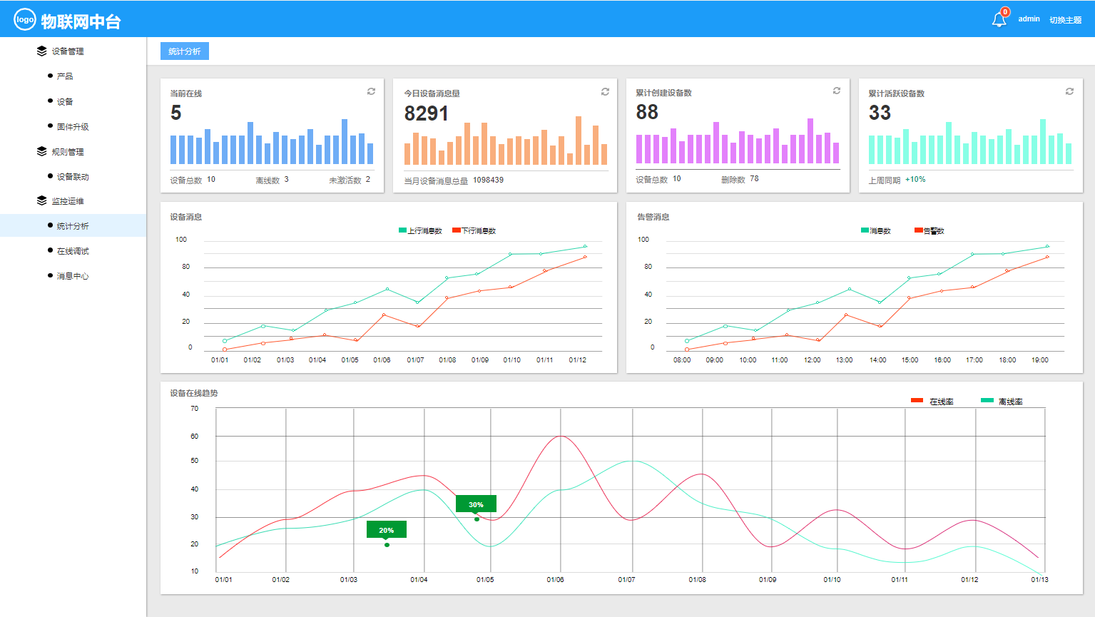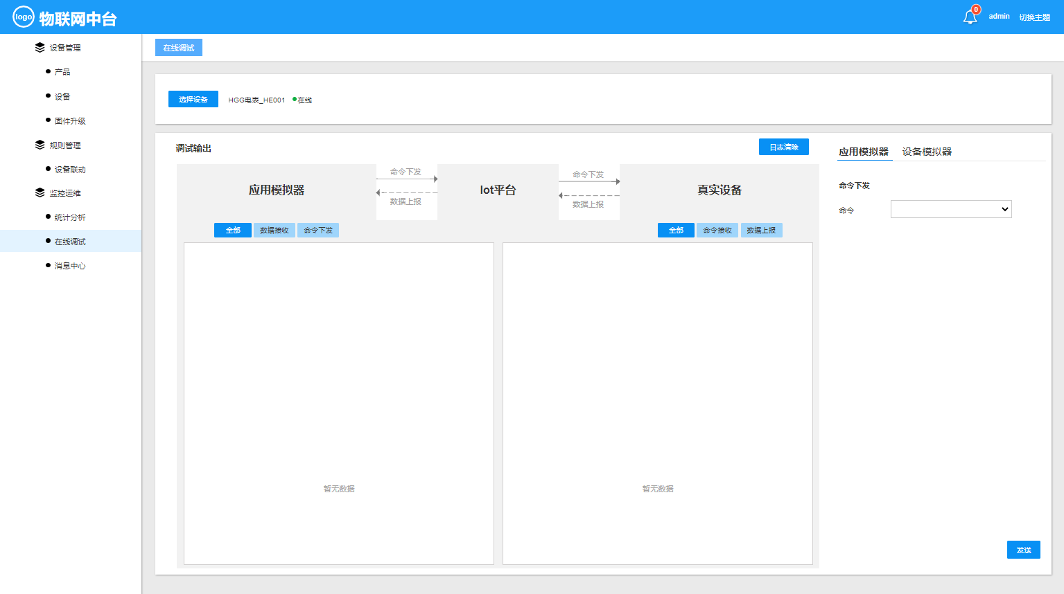 物联网中台作为连接业务应用和产品设备的中间层,减少各种复杂的设备接口的另行开发,实现设备的快速接入并提供海量设备的接入和管理,支持用户快速构建各种物联网的业务应用。本中台主要包括:产品、设备、固件升级、设备联动、统计分析、在线调试以及消息中心的功能模块。