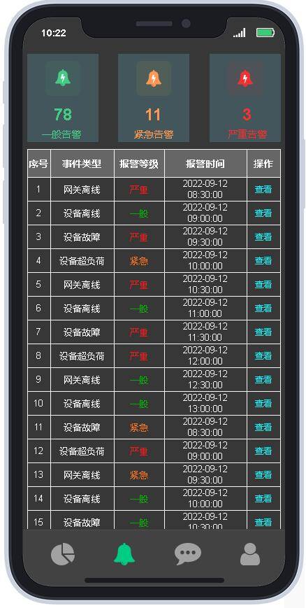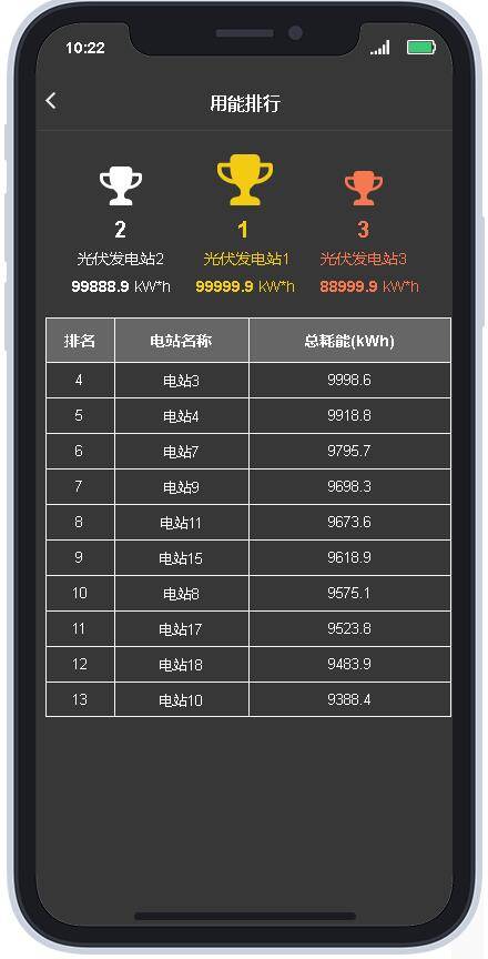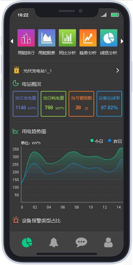 移动端电站综合分析系统,也即是电站综合管理系统的APP端设计,其主要功能是基于电站综合分析管理系统端而展开,但又基于手机端屏幕以及其他因素,所以和PC端又有所区别,但大体功能上是一致的,这样的设计是为了能数据的共享共用,并且减少重复重新开发的情况,其功能主要包括:1 数据统计(主要展示用能排行、用能报表、同比分析、趋势分析、线损分析等模块的功能);2 告警通知(主要分等级展示电站设备的报警信息,时代管理人员能实时知晓及时处理);4 监控沟通(结合监控视频系统,将实时可以查看电站内的情况,以及通过视频可以即时进行沟通对话);4 我的(主要是用户的设置以及账号安全设置等功能模块)