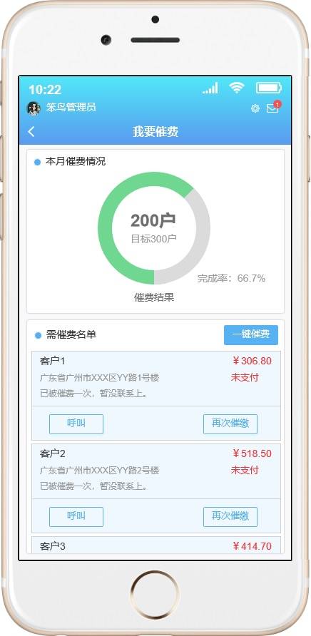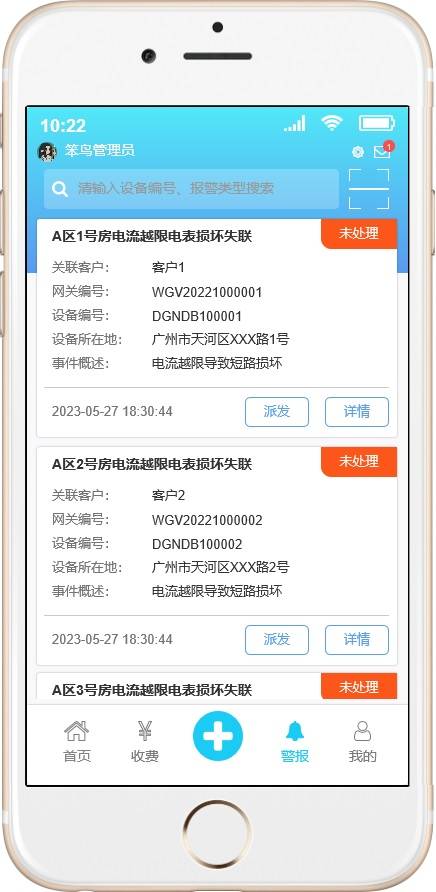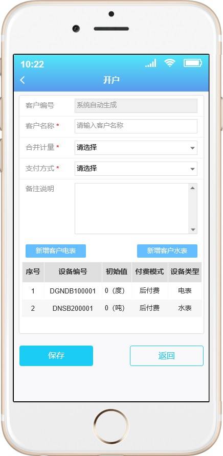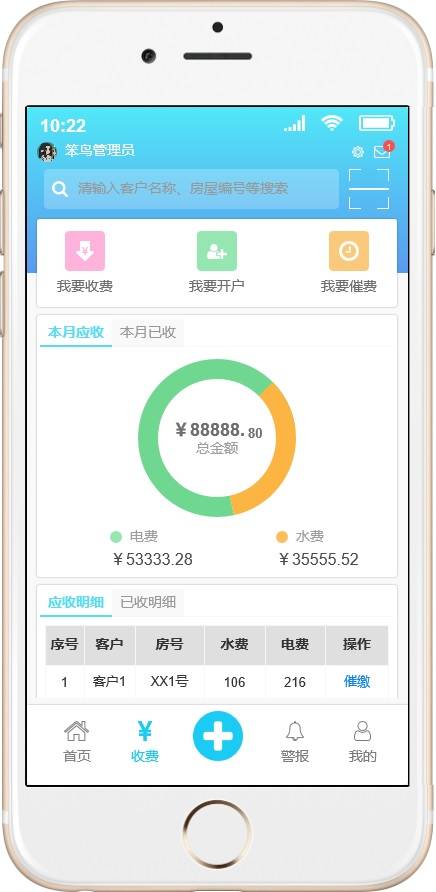 智慧水电收费APP是作为智慧水电收费管理平台的移动端,主要是平台端的主要功能的移动化,更大的方便管理人员实时掌握系统的情况和方便现场情况的处理。主要功能一是同管理端的对用水电客户的远程抄表、远程操控水电表的开和关情况,使得收取水电费不需要挨家挨户的去手动抄表,并且对于不按时缴纳费用的用户进行多次催缴,并支持实行远程停水停电的操控,极大方便了水电收费的情况以及设备报警的实时推送和即时处理。其后台管理端可参照另一个产品:《智慧水电收费系统原型设计》。