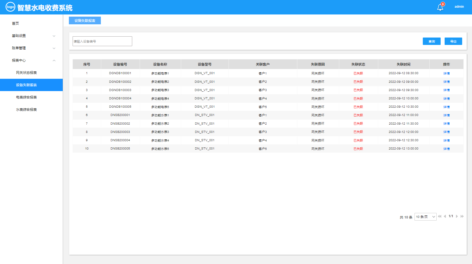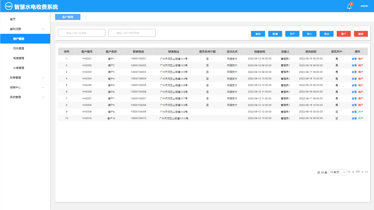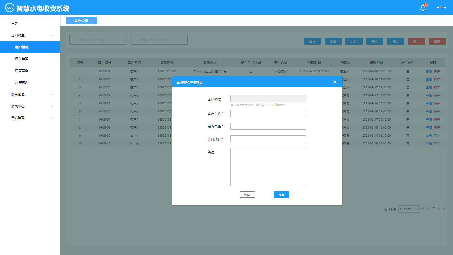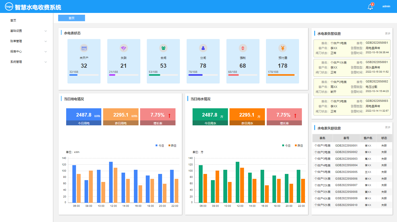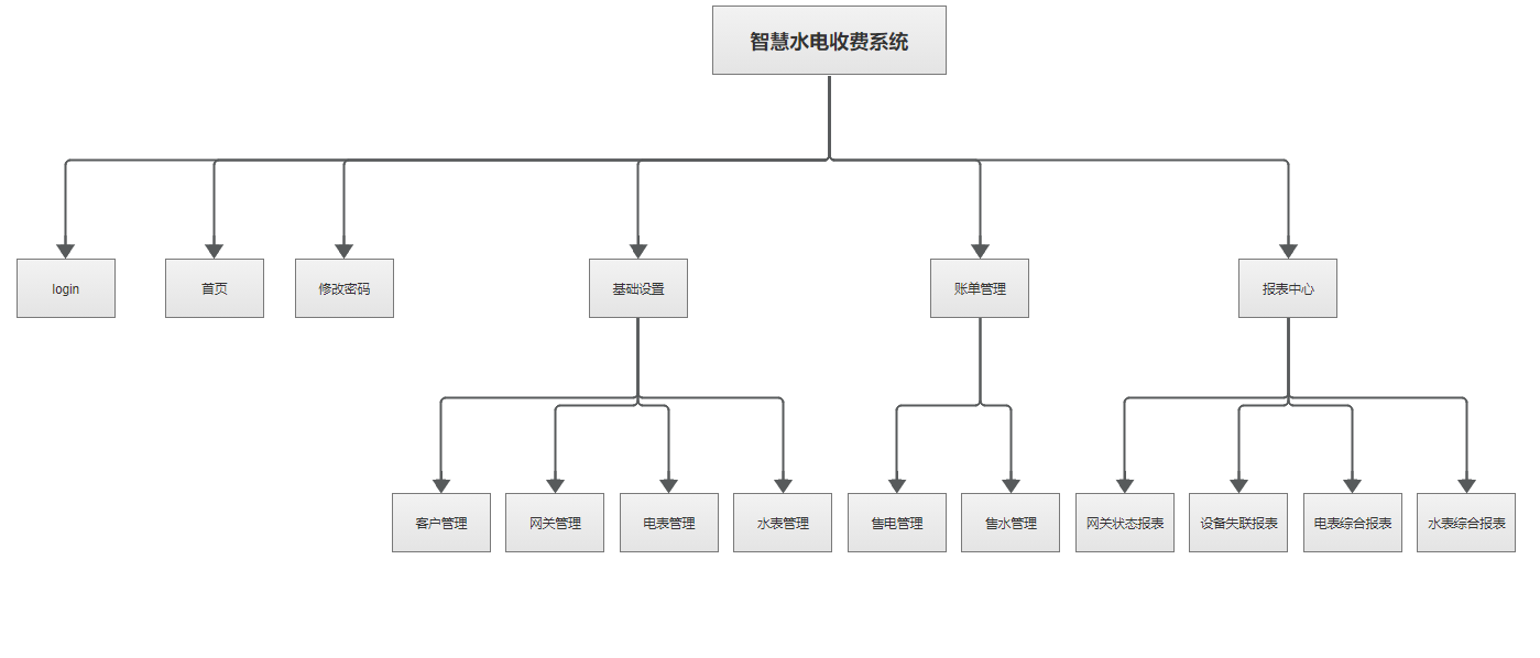 智慧水电收费系统是作为对用水电客户的远程抄表、远程操控水电表的开和关情况,使得收取水电费不需要挨家挨户的去手动抄表,并且对于不按时缴纳费用的用户实行远程停水停电的操控,极大方便了水电收费的情况,同时提供不同维度的报表进行统计分析。本系统主要包括:基础设置(客户管理、网关管理、电表管理、水表管理)、账单管理(售电管理、售水管理)报表中心(网关状态报表、设备失联报表、电表综合报表、水表综合报表)等功能模块。