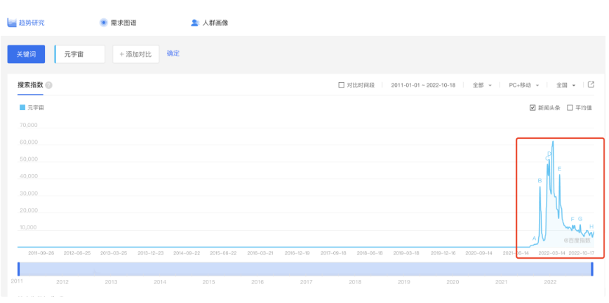 在2022年,Facebook改名为Meta后就引爆了元宇宙,你可以看到从2022年后元宇宙的热度就爆发式增长,到现在逐渐冷却。