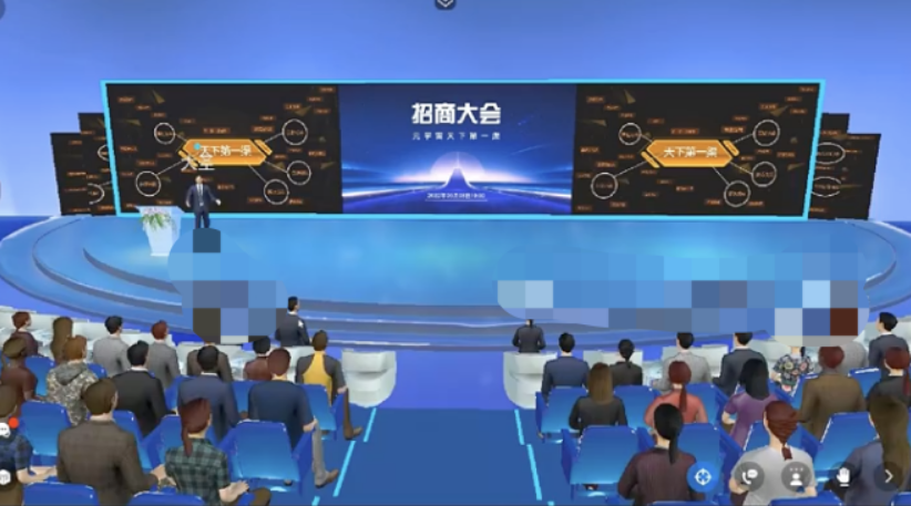 比如上图是我近期参加的某一个元宇宙线上会议,虚拟人像作为主视觉背景,但是仍然是用传统的会议功能完成会议的操办,但PPT的阅读因为会议场景模仿的实际线下大会,导致并不清晰,看来元宇宙会议系统仍然有很多技术难点。